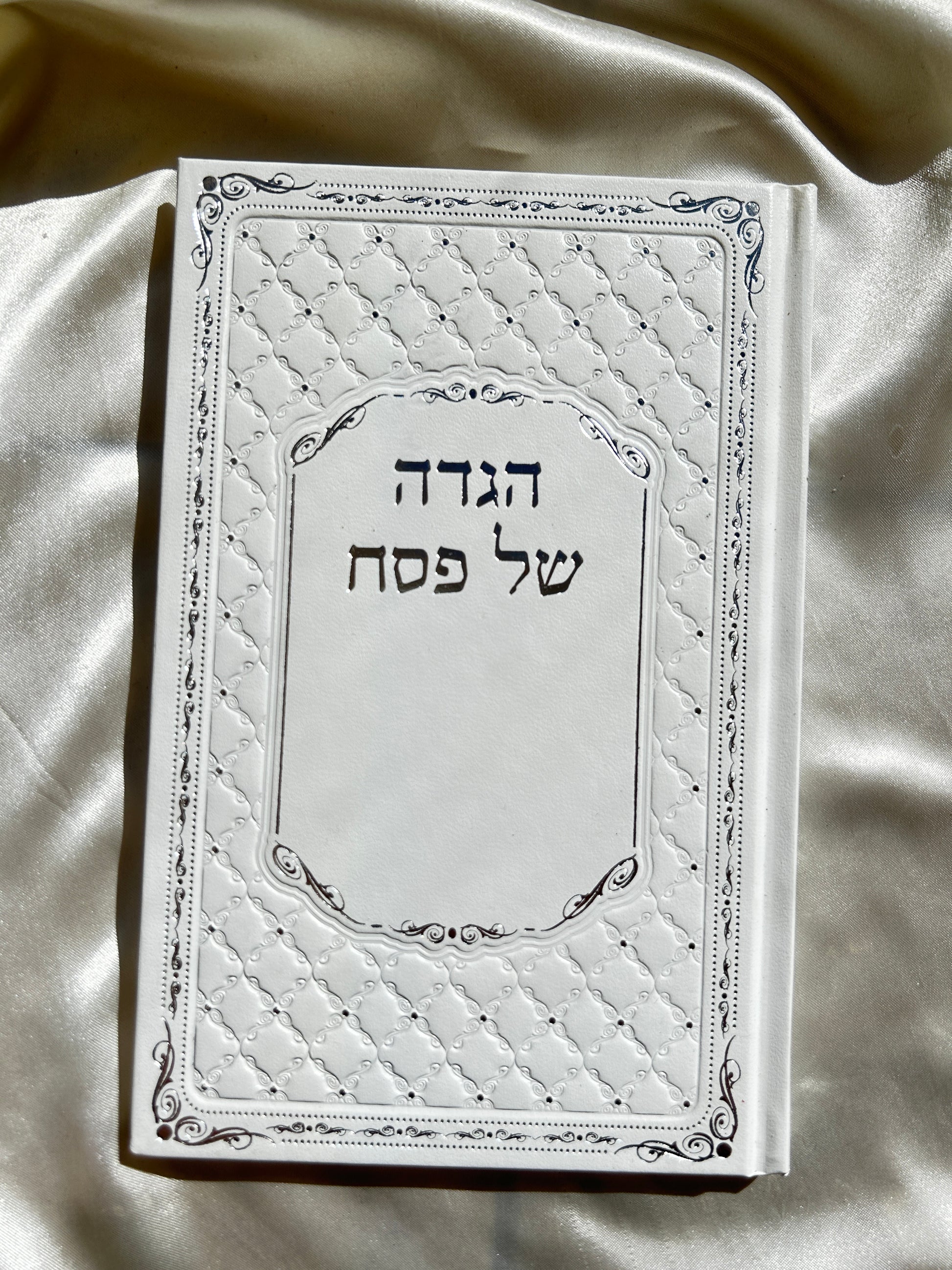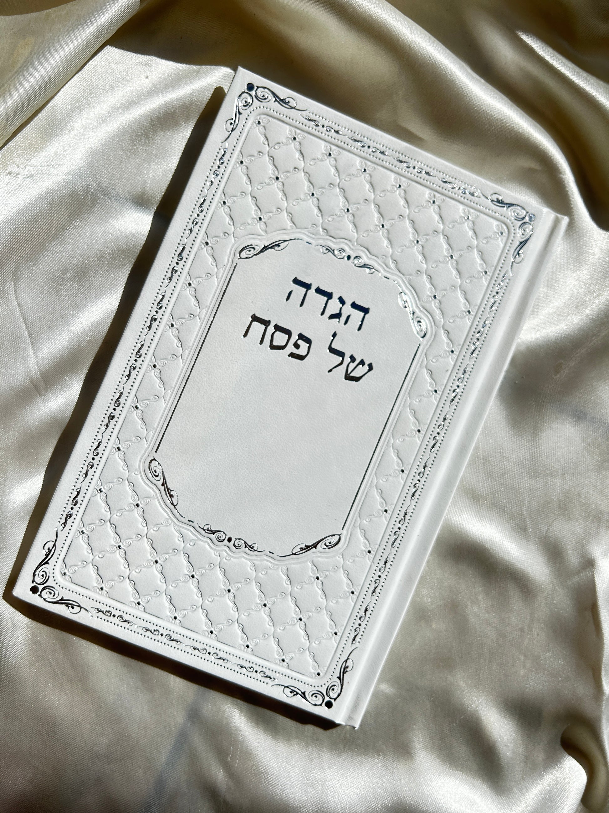 הגדה של פסח לכלל ישראל בכריכת דמוי עור מהודרת מאוד בצבע לבן עם כיתוב כסוף