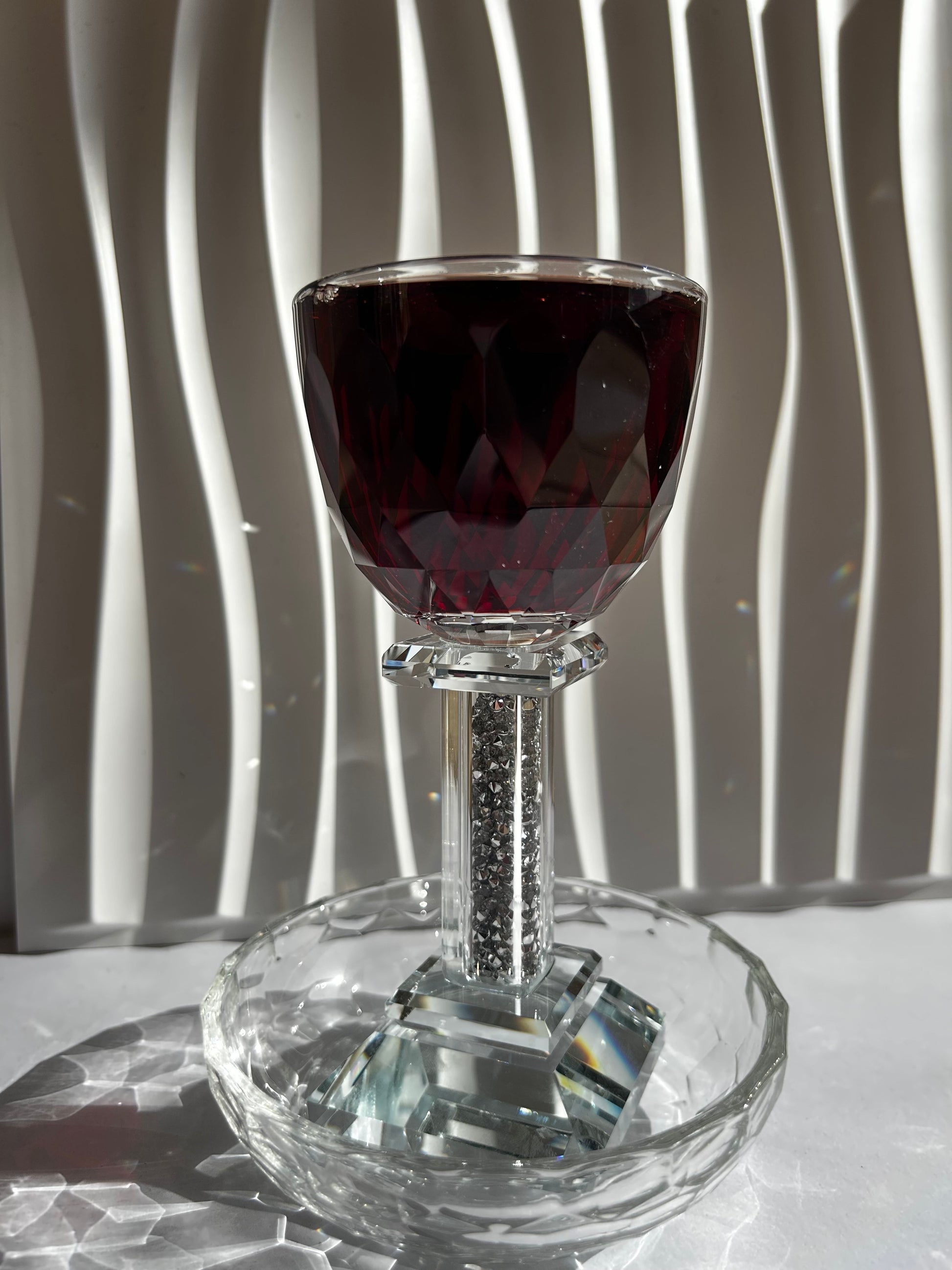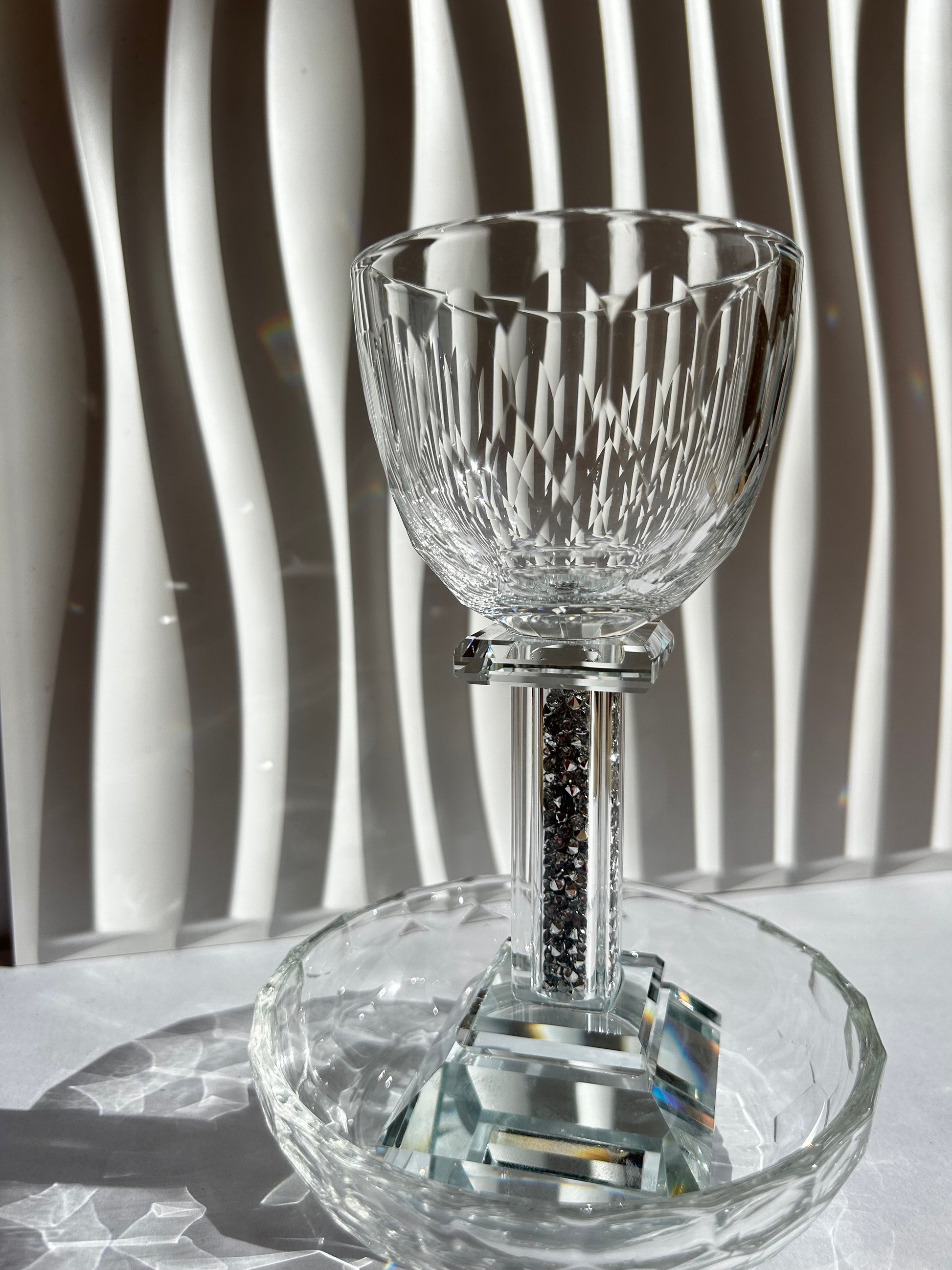 גביע קריסטל מהודר זכוכית עם רגל אבנים כסף מרובעת